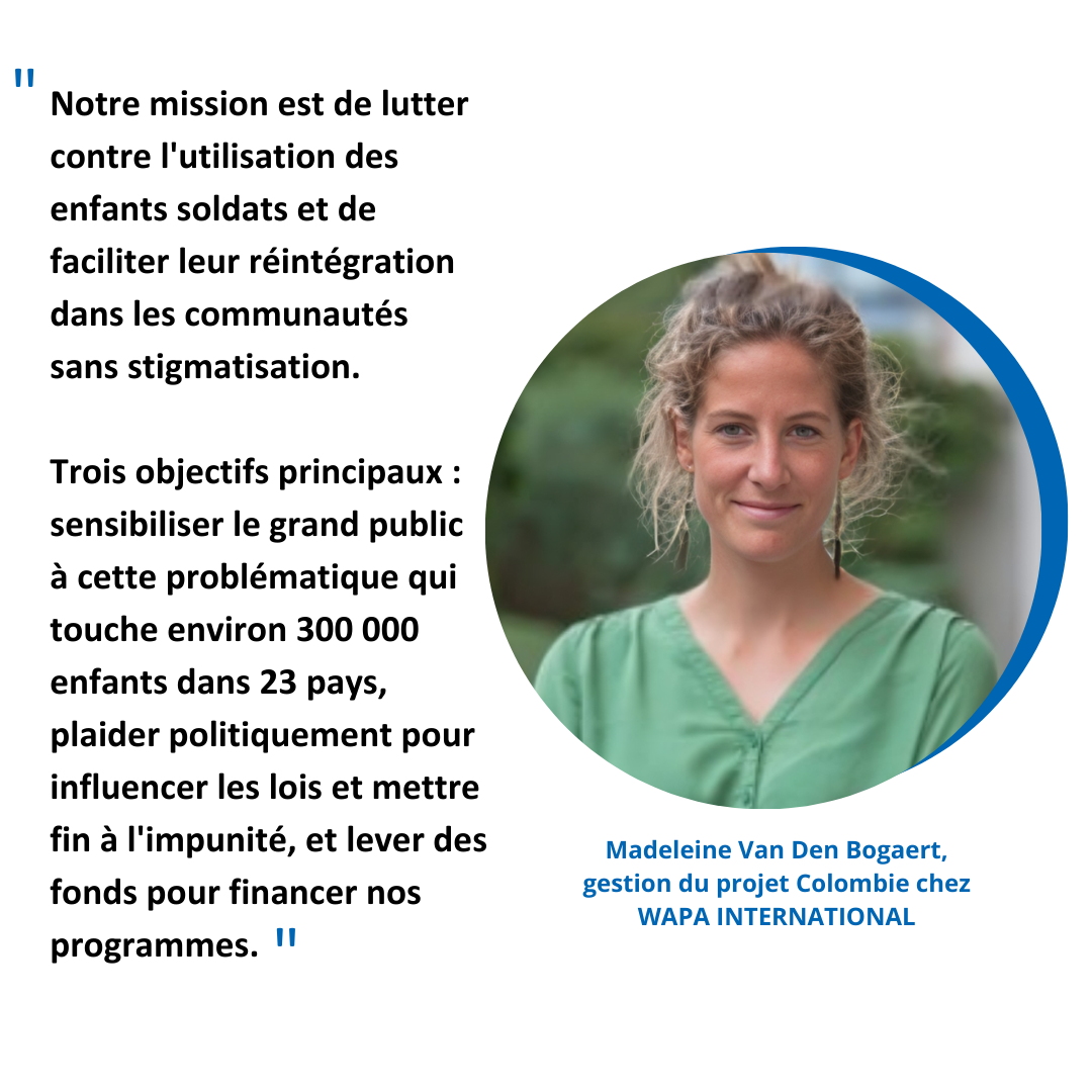 « Notre mission est de lutter contre l'utilisation des enfants soldats et de faciliter leur réintégration dans les communautés sans stigmatisation. Nous avons trois objectifs principaux : sensibiliser le grand public à cette problématique qui touche environ 300 000 enfants dans 23 pays, plaider politiquement pour influencer les lois et mettre fin à l'impunité, et lever des fonds pour financer nos programmes.